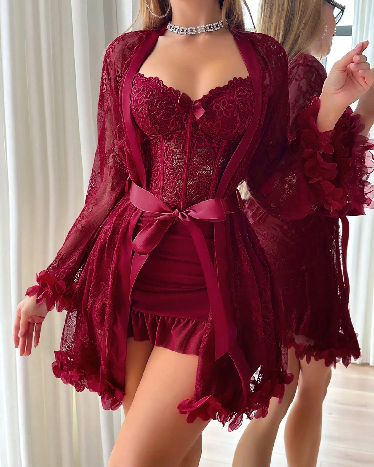 2pcs Set 3D Floral Lace Robe Nightgown Lingerie